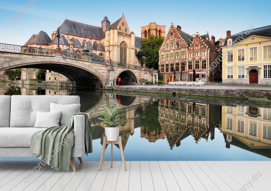 Widok na średniowieczną katedrę i most nad kanałem w Gandawie.