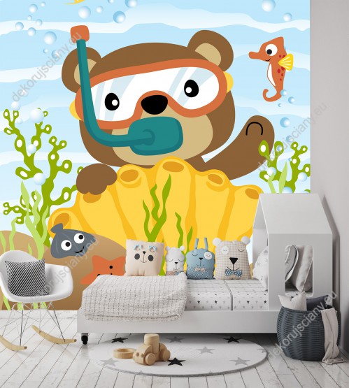 Wzornik fototapety do pokoju dziecięcego z misiem nurkującym w morzu.