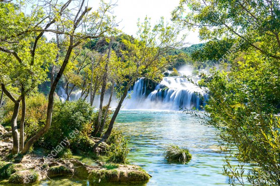 Wzornik fototapety z widokiem na wodospady Krka wśród bujnej roślinności i zielonych drzew w Chorwacji. Fototapeta do pokoju dziennego, sypialni, salonu, biura, gabinetu, przedpokoju i jadalni.