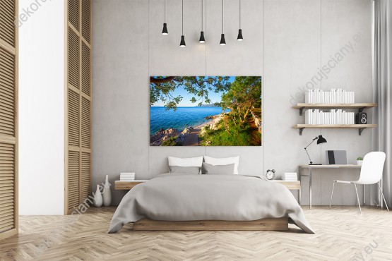 Wzornik obrazu z widokiem na krystalicznie, czystą wodę morską, na kamienistym wybrzeżu Chorwacji. Obraz do pokoju dziennego, salonu, sypialni, biura, gabinetu, przedpokoju i jadalni.