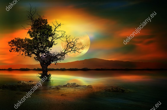 Obraz samotnego drzewa na tle barwnego nieba i księżyca.