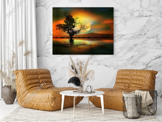 Wzornik obrazu samotnego drzewa na tle barwnego nieba i księżyca. Obraz na ścianę do pokoju dziennego, salonu, sypialni, biura, gabinetu, przedpokoju, jadalni.
