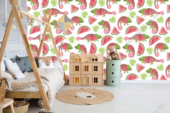 Wizualizacja tapety, kameleony, arbuzy i liście palmy na białym tle.Wizualizacja tapety, kameleony, arbuzy i liście palmy na białym tle.Wzornik tapety, kameleony, arbuzy i liście palmy na białym tle.