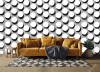 Wizualizacja tapety do pokoju dziennego, młodzieżowego, sypialni, salonu, przedpokoju, biura w nowoczesnym stylu. Tapeta w białe koła z czarnym cieniem, na szarym, nakrapianym tle.