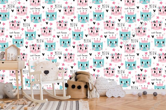 Wizualizacja tapety na ścianę do pokoju dziecięcego. Wzór tapety przedstawia różowe i zielone główki kotów, w koronach, z dużymi czarnymi oczami, na białym tle w gwiazdki.Wizualizacja tapety na ścianę do pokoju dziecięcego. Wzór tapety przedstawia różowe i zielone główki kotów, w koronach, z dużymi czarnymi oczami, na białym tle w gwiazdki.Wzornik tapety na ścianę do pokoju dziecięcego. Wzór tapety przedstawia różowe i zielone główki kotów, w koronach, z dużymi czarnymi oczami, na białym tle w gwiazdki.