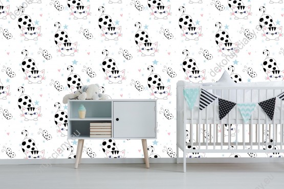 Wizualizacja tapety na ścianę do pokoju dziecięcego o tematyce zwierzęcej. Tapeta na białym tle, w koty polujące na motyle.Wizualizacja tapety na ścianę do pokoju dziecięcego o tematyce zwierzęcej. Tapeta na białym tle, w koty polujące na motyle.Wzornik tapety na ścianę do pokoju dziecięcego o tematyce zwierzęcej. Tapeta na białym tle, w koty polujące na motyle.