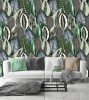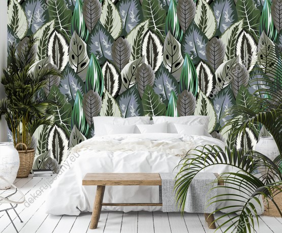 Wizualizacja tapety, wzorzyste liście w odcieniach zieleni.