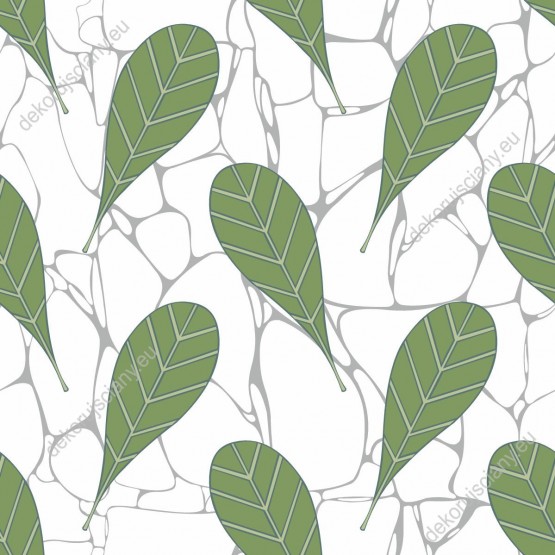 Wzornik tapety do pokoju dziennego, sypialni, salonu, przedpokoju, biura. Tapeta przedstawia zielone liście i szarą siatkę, na białym tle.