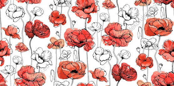 Wzornik tapety do pokoju dziennego, sypialni, salonu, przedpokoju, biura, kuchni. Tapeta przedstawia wiosenne, czerwone kwiaty maków, na białym tle.